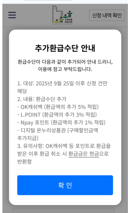 - 2025년 9월 25일 이후 환급 수단 추가 - OK캐쉬백 (환급액의 5% 추가 적립), L.POINT (환급액의 3% 추가 적립), NPay 포인트 (환급액의 1% 추가 적립), 디지털 온누리 상품권(구매할인금액 추가지급)