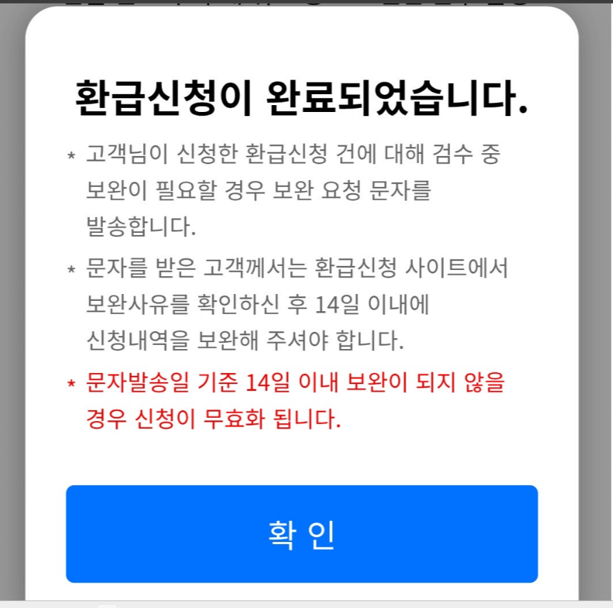 - 서류 누락: 영수증이나 제품 라벨 사진이 빠진 경우나 식별 불가능한 흐릿한 사진 업로드 시 반려 → 14일 이내에 다시 제출하면 됩니다.
