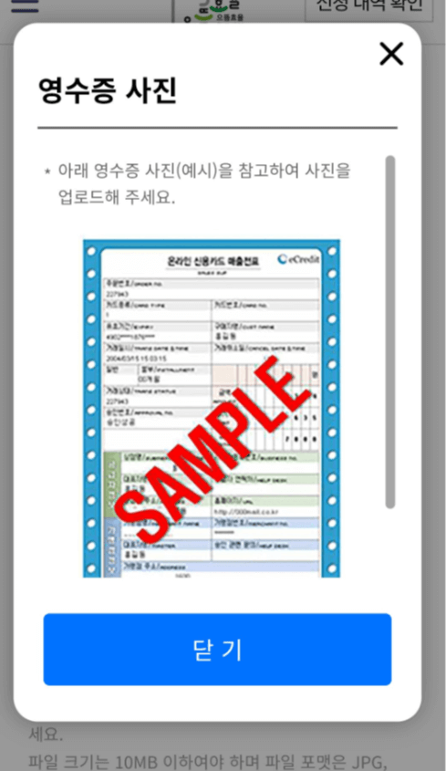 - 사진 파일 크기는 개당 10MB 이하, 포맷은 jpg, png, gif, pdf 등 캡쳐, 스캔, 사진 가능